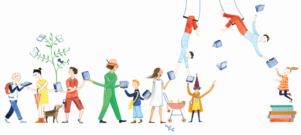 This image by Sarah Wilkins from A Book Is a Book represents so well that reading books is both solo and social, depending on all the people who recommend, share, buy, borrow and talk about books—and put them into our hands, of course.