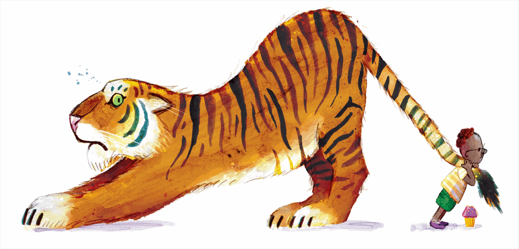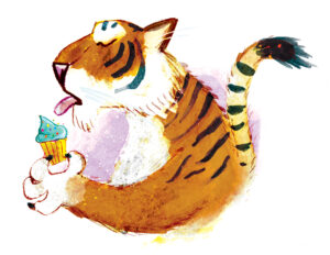 David is very clever with the way he manages to fill out the book. I had initially said to him, well I don’t think there will be a book because the story isn’t long enough. But he wanted to have a little bit of fun at the beginning with the tiger eating a lot of cake. The story really doesn’t need language; it just needs pictures. And he did it beautifully.
