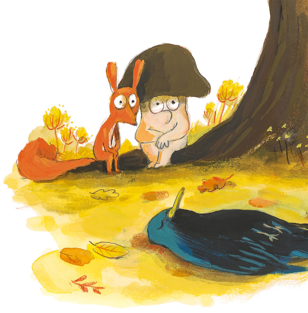 We are publishing a kind of cousin to that book this year with Is It Asleep? by Olivier Tallec. Three friends find a bird on a path in the woods. After much debate, they realise the bird has died, so they set about giving it a magnificent send-off.